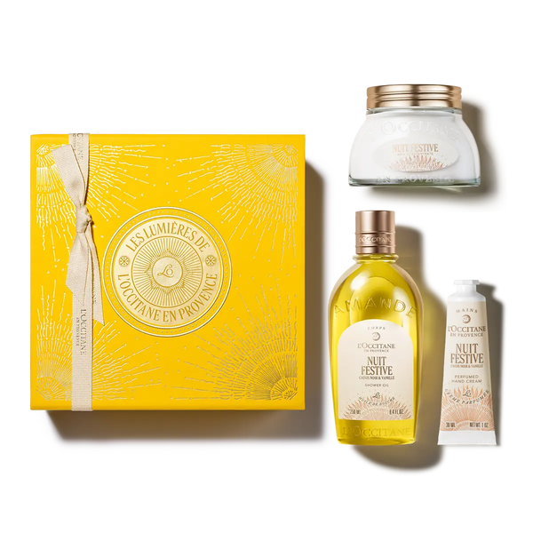 Limpia, hidrata y perfuma tu piel disfrutando de la colección de Edición Limitada Nuit Festive con aroma frutal y gourmand dentro de una caja de regalo.